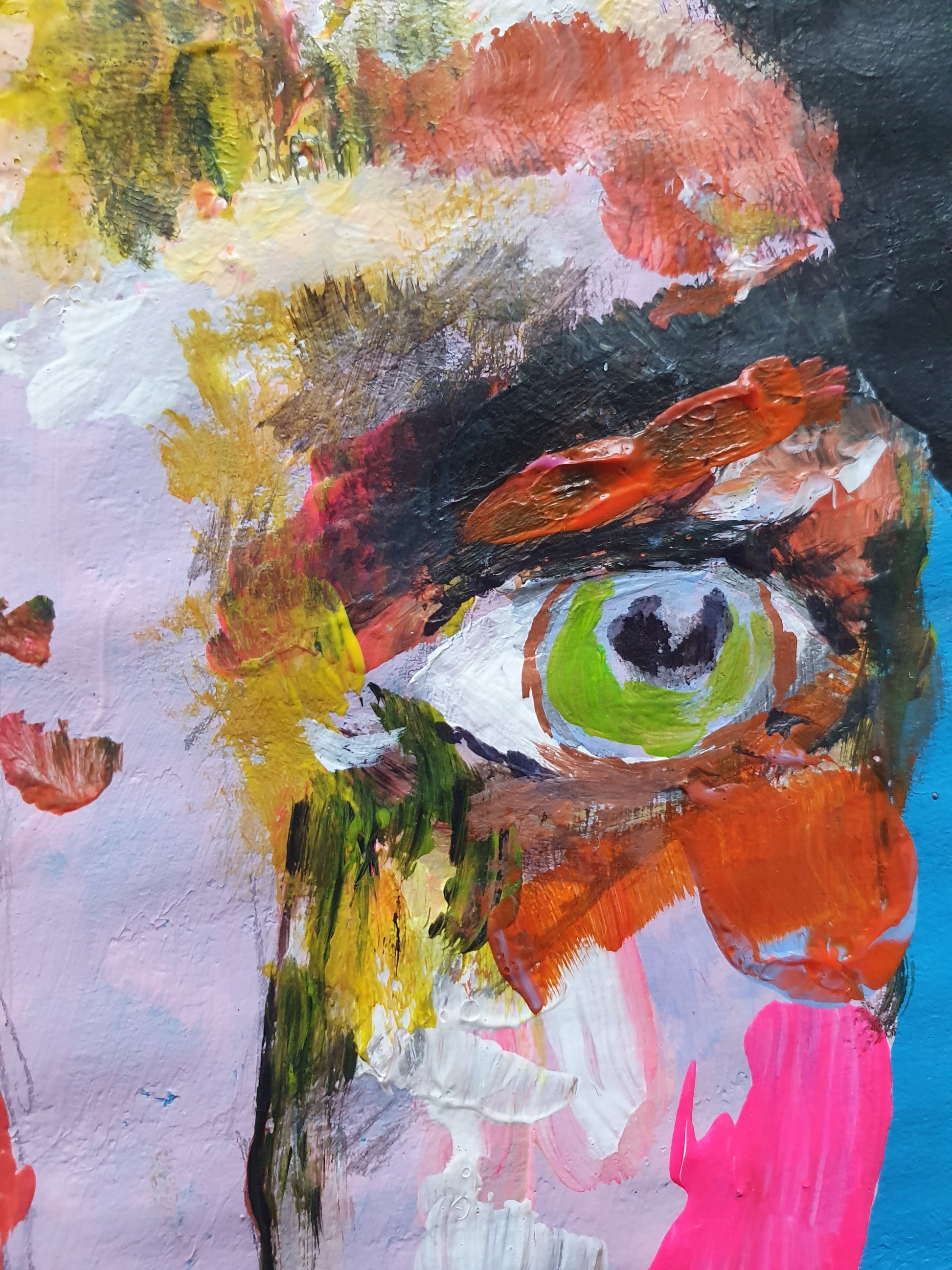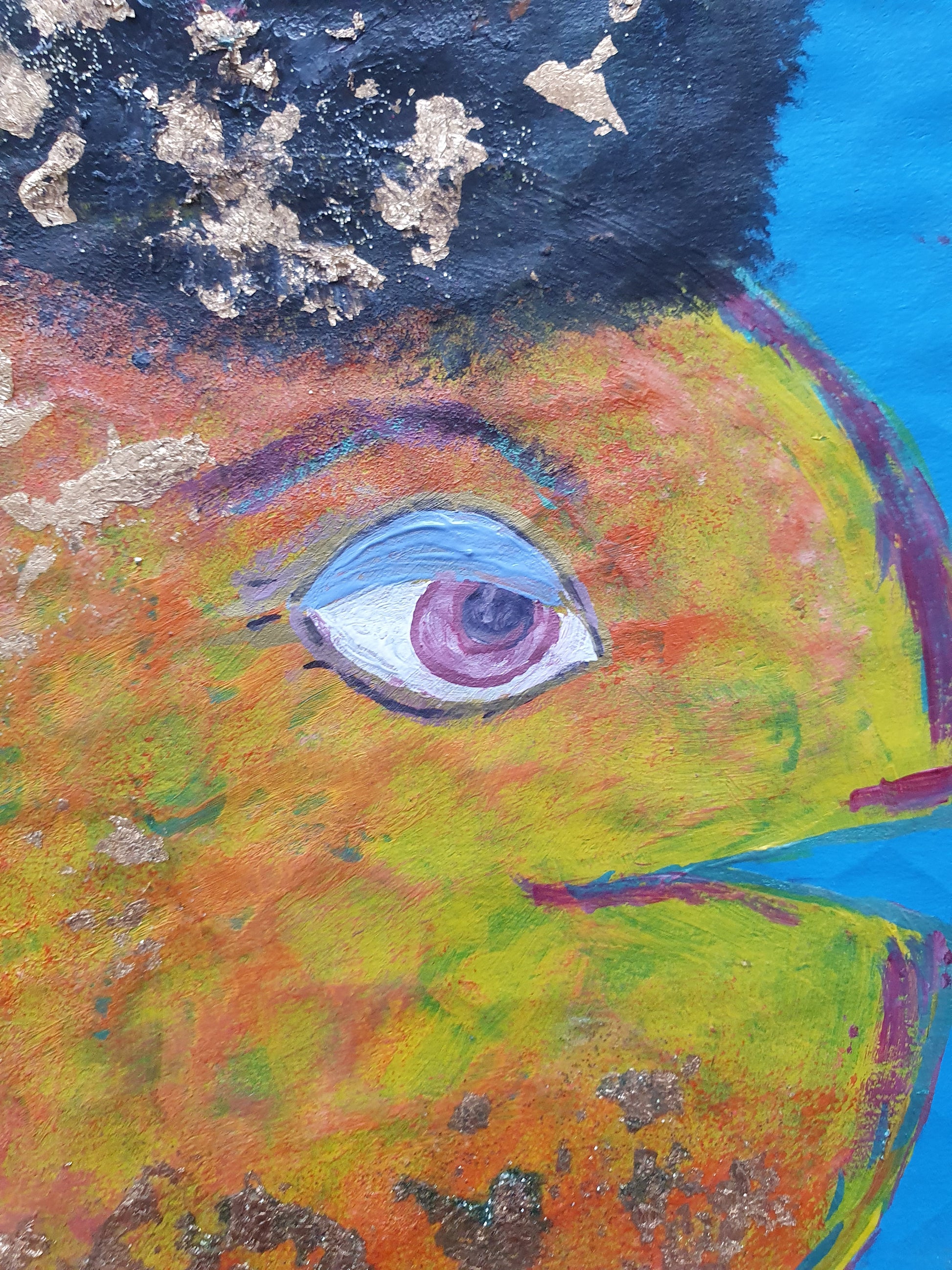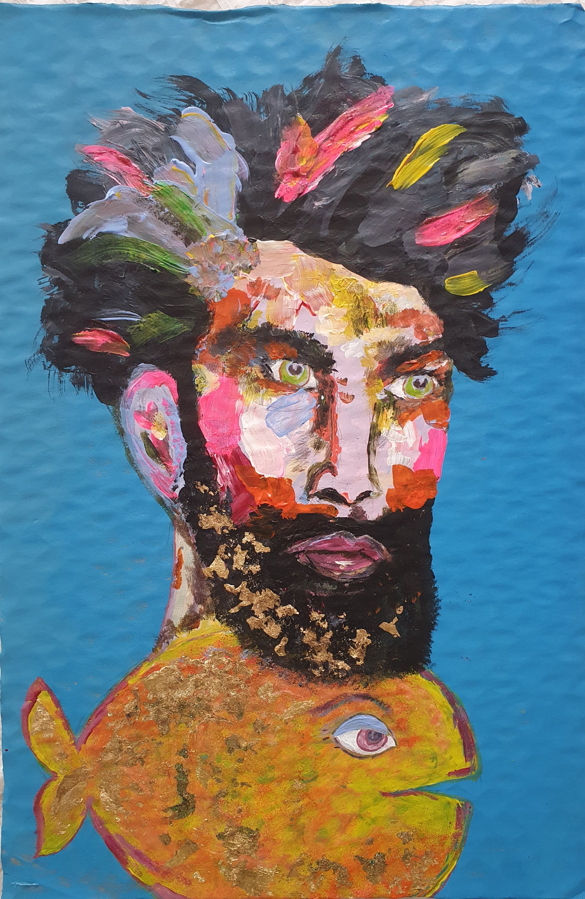 What a man?! Bild auf 28x 41 cm großer Wellpappe mit Acrylfarben, Goldflocken und Glitzer gemalt