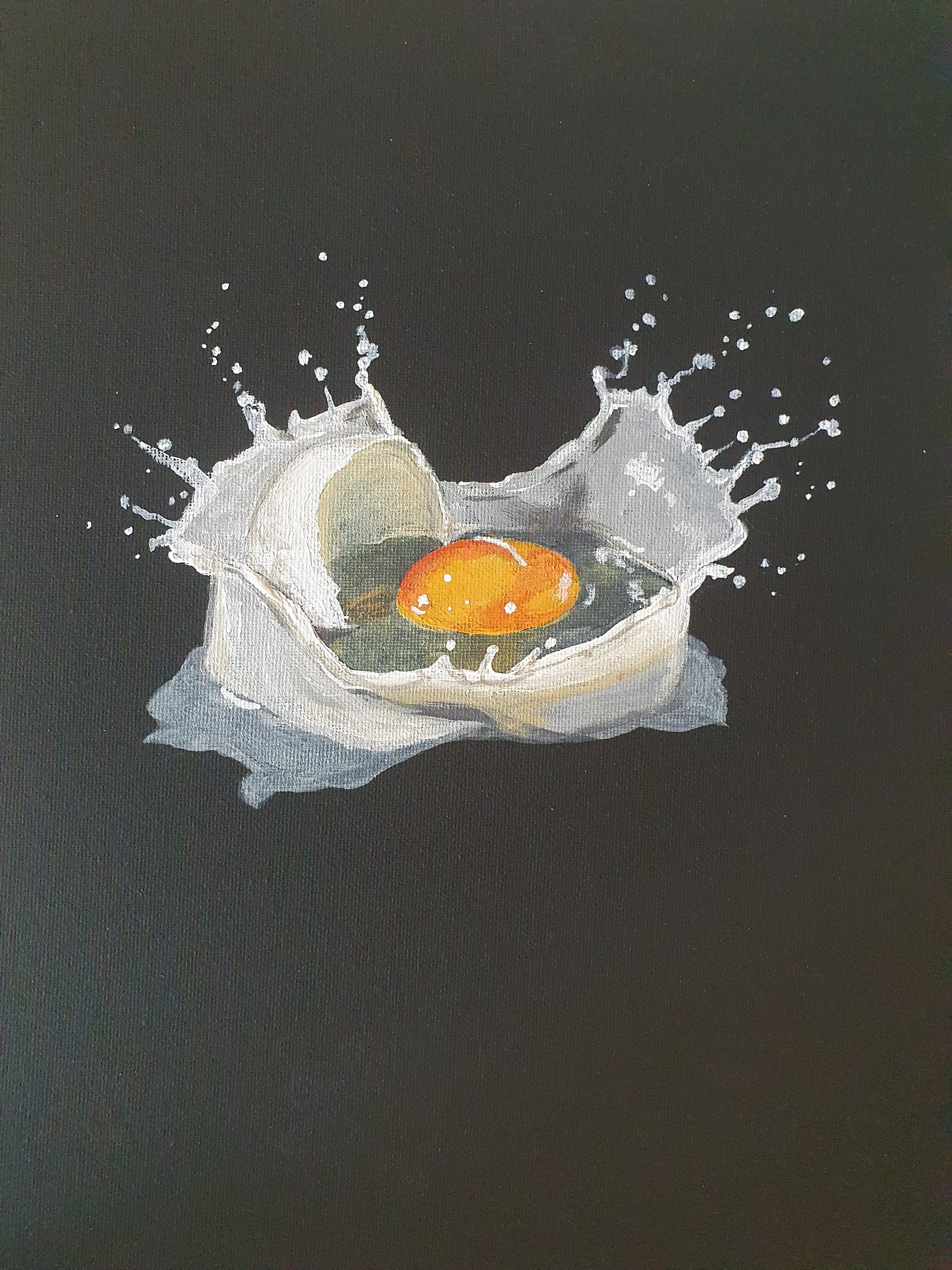 In EI MAZING zerbricht das EI genau im perfekten Augenblick: Die Schale springt auf, das Eigelb leuchtet kräftig und feine Spritzer fliegen in alle Richtungen. Der starke Kontrast zum tiefschwarzen Hintergrund lässt das EI regelrecht aus dem dem Bild herausplatzen.